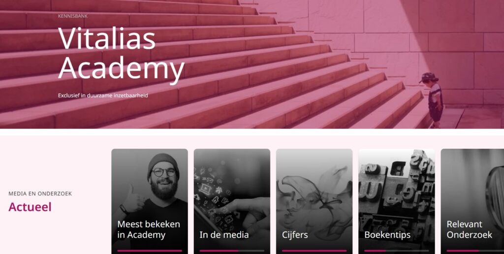 De Vitalias Academy is een online kennisbank met actuele en verdiepende informatie, relevante cijfers en bevat korte leereenheden. Bovendien, onze professionals gebruiken de Academy in de spreekkamer. Door kennis op een interactieve manier aan te bieden, ontstaat er consistentie in het leer- en bewustwordingsproces. En dat draagt bij aan het verhogen van duurzame inzetbaarheid. Opdat medewerkers langer en gezonder kunnen blijven deelnemen aan het arbeidsproces.